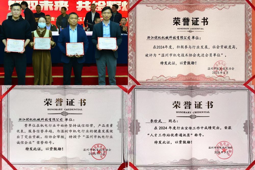3月26日,在溫州市機(jī)電技術(shù)協(xié)會五屆三次會員大會上,浙江優(yōu)機(jī)機(jī)械科技有限公司憑借卓越表現(xiàn),榮獲2024年度"溫州市機(jī)電行業(yè)誠信企業(yè)"和"溫州市機(jī)電技術(shù)協(xié)會先進(jìn)單位"兩項(xiàng)榮譽(yù)稱號。公司總經(jīng)理李珍武同時(shí)獲評"機(jī)電協(xié)會人才工作站優(yōu)秀通訊員"稱號。